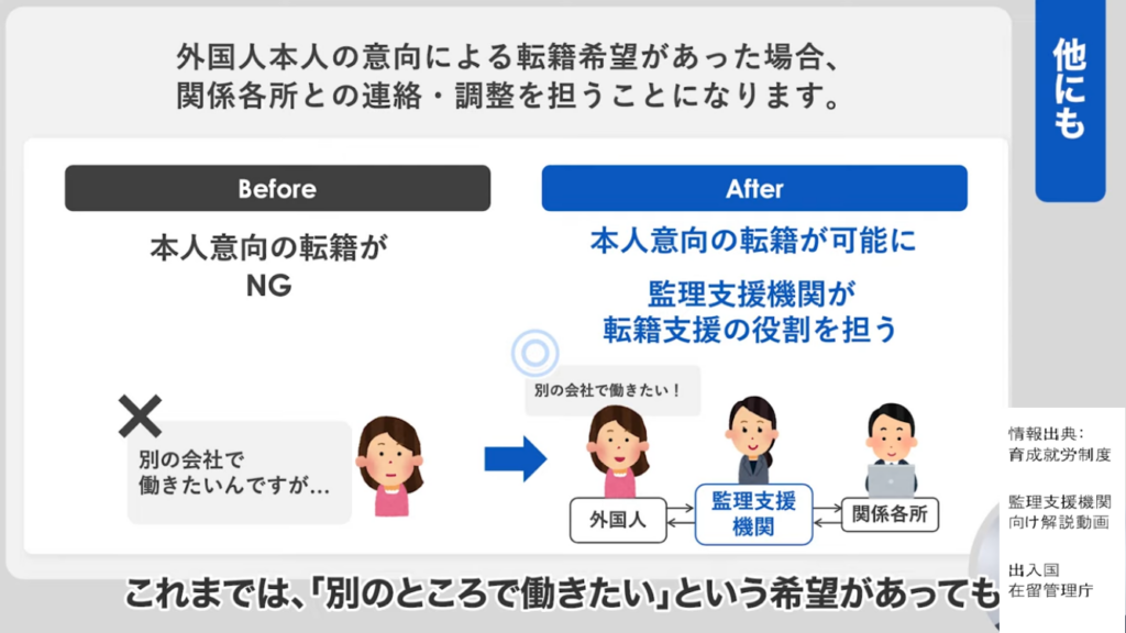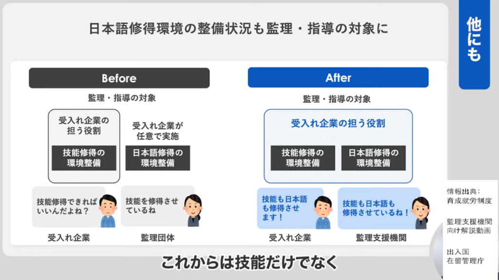 - 新:育成就労(監理支援機関):人材確保・育成、本人意向の転籍支援、日本語能力向上。